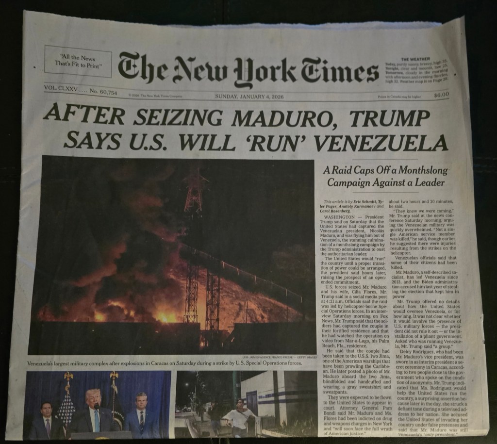The Gray Lady Speaks – whether you are a fan of this liberal paper or despise it as a pinko, Commie rag, here is the headline that publication ran the day after the United States seized President Maduro of Venezuela.