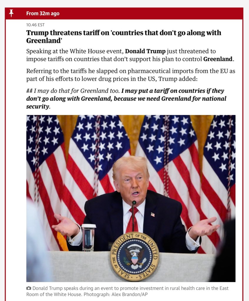 It was not too many days after the takeover of Venezuela and the shooting in Minneapolis of Renee Good that President Trump turned his attention to Greenland. He decided it would be a good idea to threaten 10% tariffs on European countries that sent troops to Greenland. This new threat was aimed at our longest standing allies in Europe along with the tiny country of Denmark and the quite larger island of Greenland as the principle target.