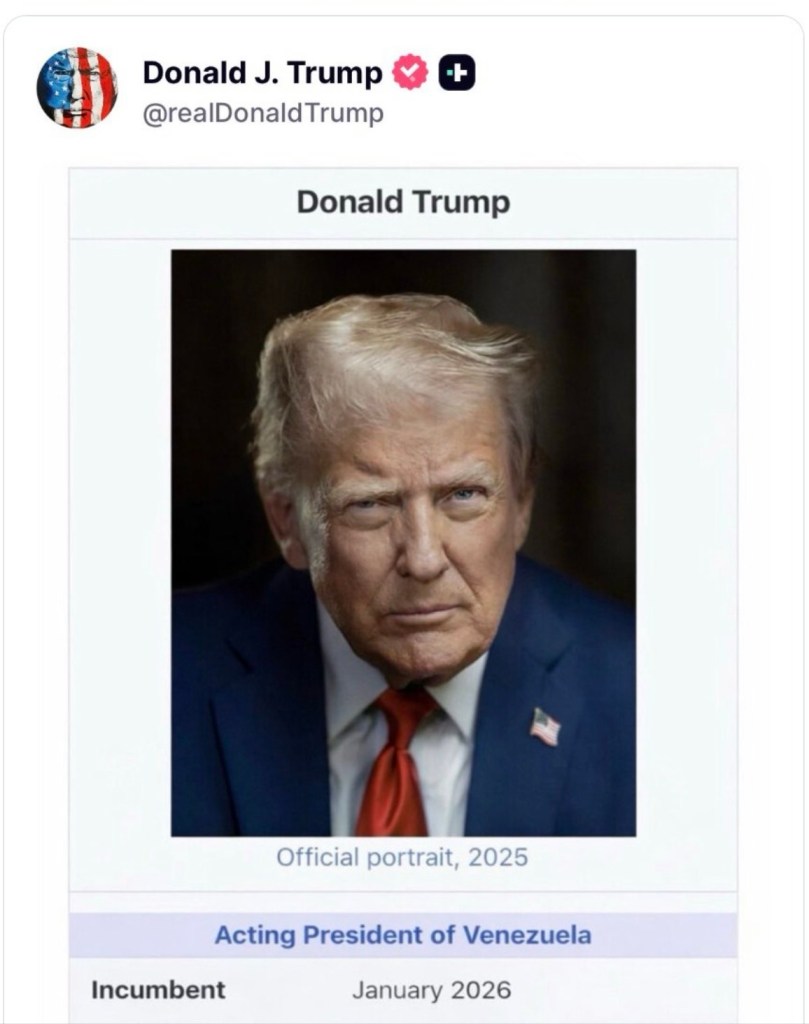 President Trump decided that the time had come to remove the President of Venezuela, run that country and take over its oil production. To make his point clearer, President Trump later posted an altered image saying he was the “Acting President of Venezuela.