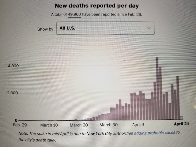 I think one of the points of this man’s study was that when the weather gets warmer and sun comes out, the Coronavirus will go away. I hope it is so. And if you ask me it will come none too soon for the Trump Administration. On that very day, the Coronavirus was approaching 50,000 deaths, up almost 30,000 deaths since I started writing this blog story. My, how the time and numbers do fly.