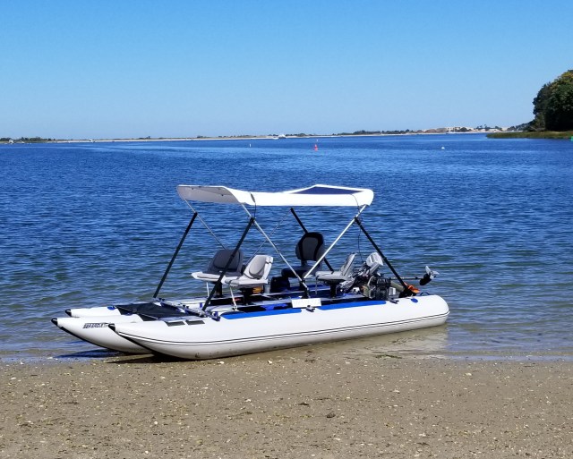 A drop stitch canopy is a very expensive solution to our traditional canopy for an inflatable boat. It is far more expensive than a fabric canopy, but it does have some distinct advantages. It is rock rigid and it covers a larger area and gives 100% UV protection – no ray of sunlight is going to get through that baby. As an older man with many, many years of outdoor & UV exposure, I need all the protection I can get. And it has another interesting characteristic. Because it is flat and very rigid, wind does not affect it nearly as much as our traditional fabric canopy. So, while cruising, the drop stitch canopy barely moves even when there is a very brisk wind of 15 or 20 mph.