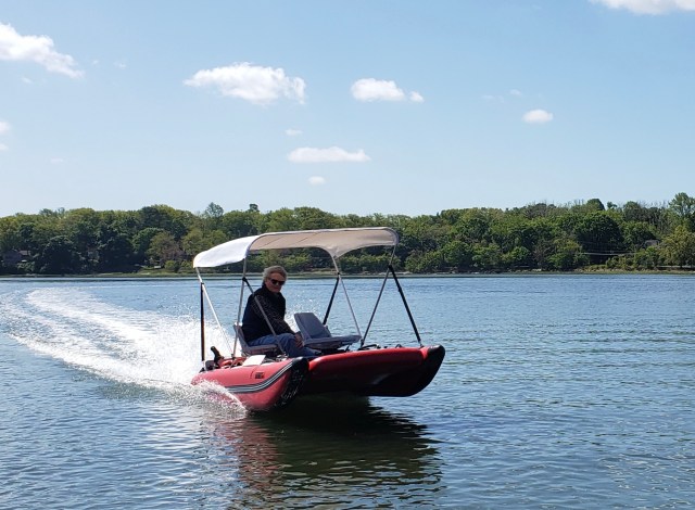 Off the three of us went in the newly rigged Mighty TriTiki – Josh, Chuck and me – off into the wild blue yonder, quietly cruising out onto Little Bay – enjoying one of the first truly nice days of this new spring. Now the Mighty TriTiki has a max speed of 5 mph, so kneeboarding is not on the agenda. That said, it is wonderfully quiet craft as it plows it’s way through water. The fact there is no charging of the batteries necessary, makes cruising around a dream come true. We motor out to the mouth of Port Jefferson Bay, drop a line in water. No luck, the season is still early for fishing. Nevertheless, the sun and early spring warmth made it another day in paradise.