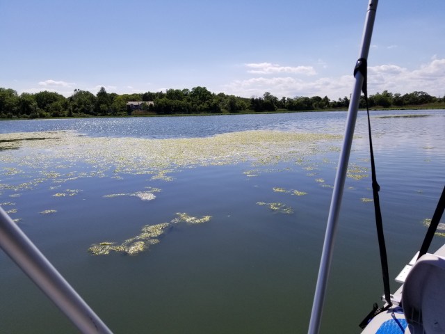 Here is a view from my TriTiki of a pretty large gathering of algae. I would guess the pod in the distance measures 75’ x 25’. That is really large when compared the the pods we had last summer which were never more than 15’ x 5’. Yes, algae is ever-changing and on the move. As Heraclitus, a Greek philosopher, said many centuries ago, “change is the only constant”.