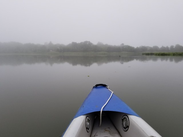 The weather on this day is naturally humid and warm – the temperature is in the mid 70s. It feels cool, wet and warm…all the same time. The grey fog that hangs over the bay gives the day a feeling unreality, as if I am paddling in mixed soup composed of water and clouds and mist with no clear demarcation where one begins and the others end.
