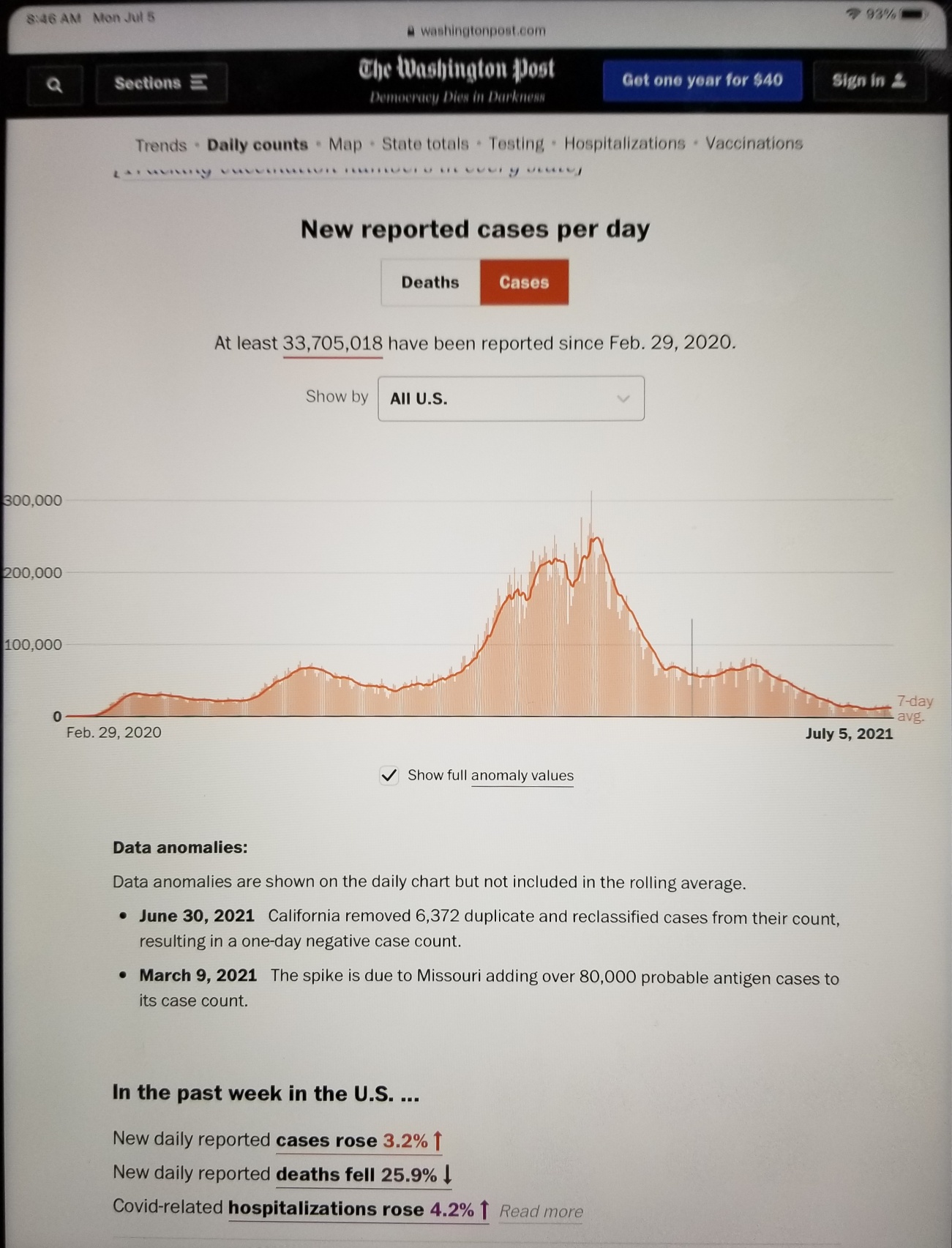 But controlling the Pandemic in the U.S. and having it rise up in other parts of the world is not the same as having it disappear and be forgotten. It is true that the number cases, hospitalizations and deaths have declined rapidly in this country in the last several months. Yet it is pretty hard to say it is under control – even now, 5,000 to 20,000 cases are being announced each day and while that is a lot less than this winter, it is not that much less than same time last year.